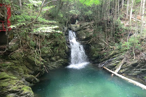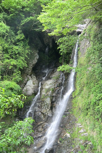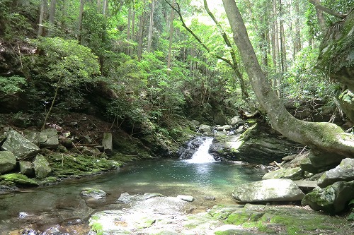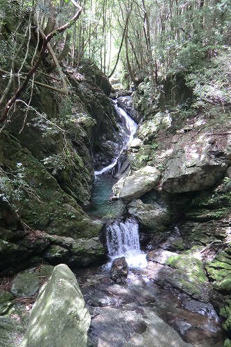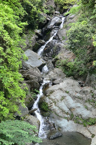 さらに進むと「箱淵の滝」この先には「金山の滝」や白倉峡の名前のもとになった白い岩「しらかけ」があるが、先を急ぐのでバイクに戻る。