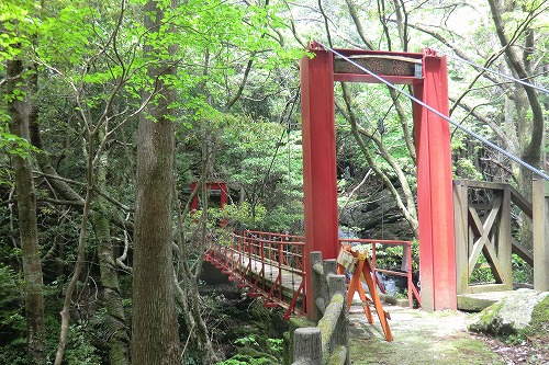 足を先に進めると赤い橋が現れ「機織り淵」がある。