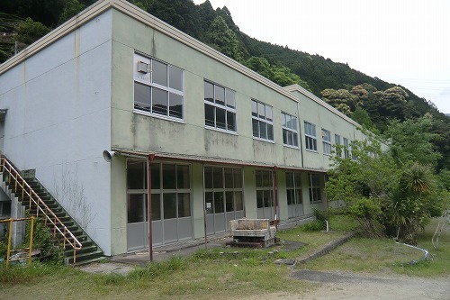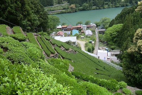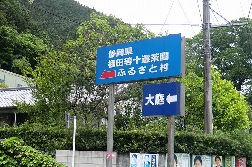 左へ折れてしばらく進むと「棚田等十選茶園」の案内板があり、廃校となっている小学校にバイクを止めて茶畑を上がる。