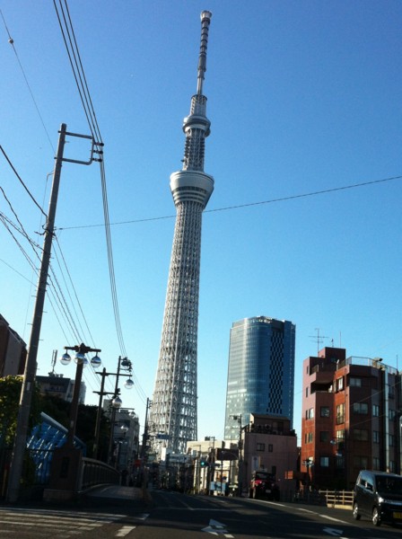 隅田川にかかる言問橋を渡ると、東京スカイツリーが真正面に見える。