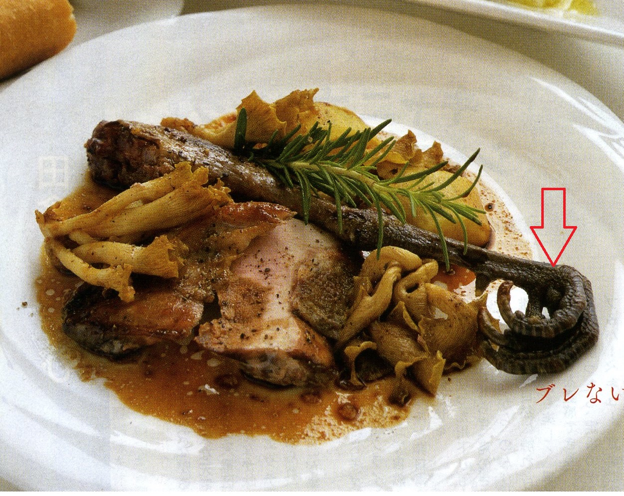 ガイドブックに「豚の血のテリーヌ、原木シイタケのスープ、ヤマドリのロースト」が紹介されており、それが下の写真。
