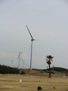 海岸線に沿って風車が並んでいるが、風が弱く、風車は全部停止している。
