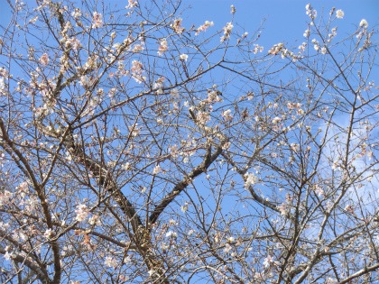 開花時期は終盤を迎え花の数は多くはないが、小さな桜が冬の青空のもとで咲いている。