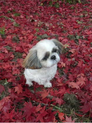 年賀状の写真にと、モコを落ち葉を背景に撮ろうとするが、あまりよいポーズをとってくれない。