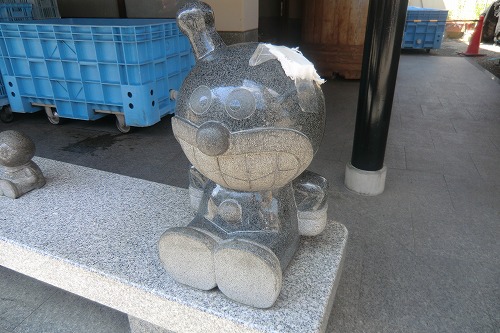 可愛そうなバイキンマンの石像、耳が折れてガーゼで止血中?