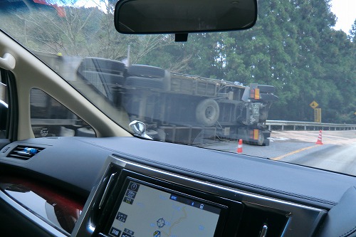 帰路を257号線で帰ると、設楽町の山間地で赤色灯を持った警察官に停止を命じられ「しまった!ネズミ捕りに捕まった」と思いきや、トラックの単独事故の交通整理だった(ホッ)