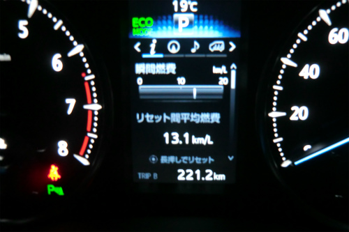 走行距離221km、平均燃費13.1km/L、排気量2.5L、車重2tにもかかわらず非常に燃費が良い。