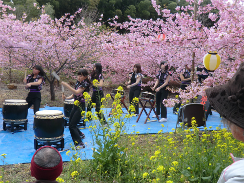 先ほどの夫婦が左手に見えるピンクの帯を指して、河津桜がとてもきれいでしたよと教えてくれ、1時から和太鼓の演奏があるとも教えてくれた。