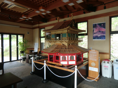 バイクを安土城城址の駐車場に移し、駐車場にあるトイレに併設された休憩場を覗くと、安土城の天守の模型が展示してある。