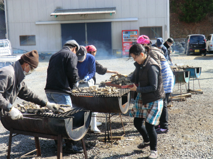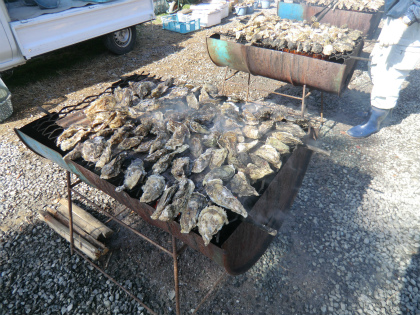 ドラム缶を半分に切ったグリルで、次から次に牡蠣が焼かれていく。