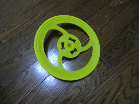 リビングの床で駒のように回すと、「ウワッ、ウワッ」とフリスビーに向かって吠えるが、飛びつくことはない。
