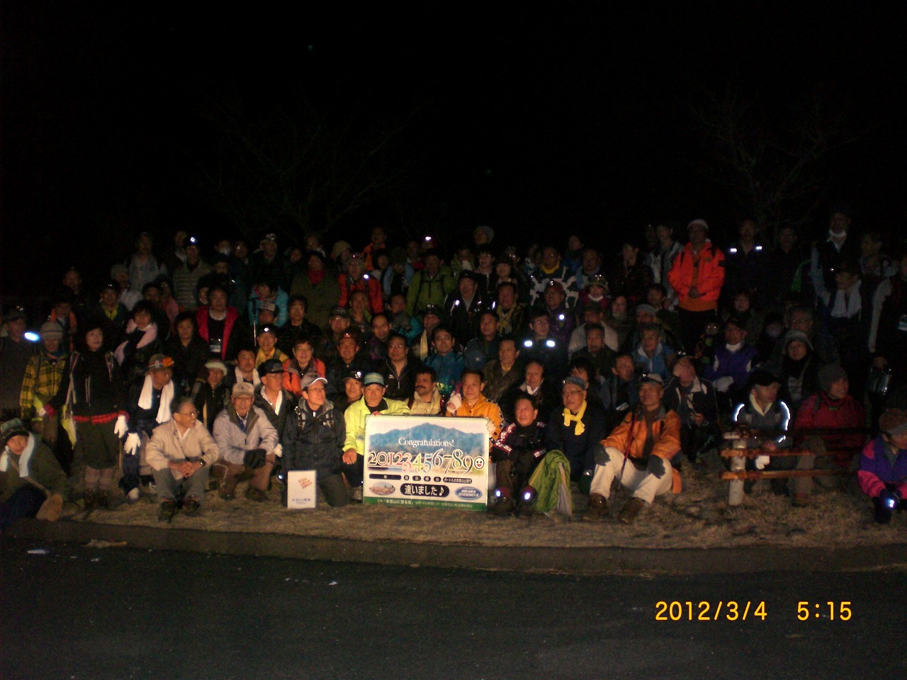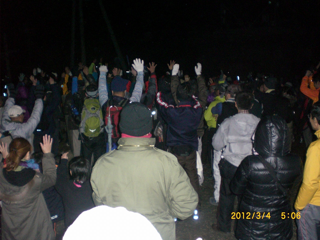 5時6分 万歳三唱した後、駐車場へ場所を移して記念撮影して下山した。