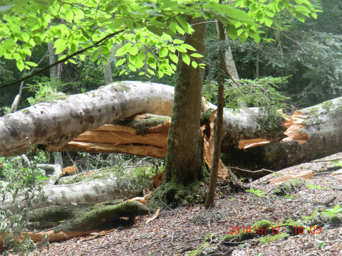 樹の重さに耐えきれず、ごく最近倒れたと思われる巨大なブナの木。