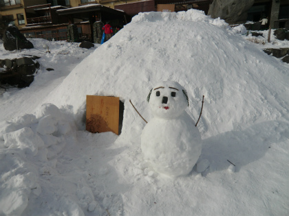 ホテルの前ではソリ遊びに興じている子供たちがおり、雪だるまやかまくらが作られている。