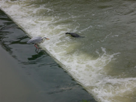 アオサギは堰堤を上ってくる魚を狙い、カワウは川の中に潜って魚を取っている。