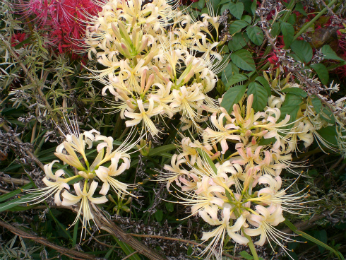 彼岸花のほとんどは赤い花だが時々白い花が咲き、昨年のブログに書いたように、我が家の近く2か所に白い花が咲いている。