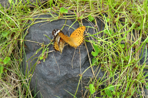 8月29日のブログに、ツマグロヒョウモンの幼虫とサナギのことを記したが、今朝はカップルが合いを楽しんでいるような光景に出会った。