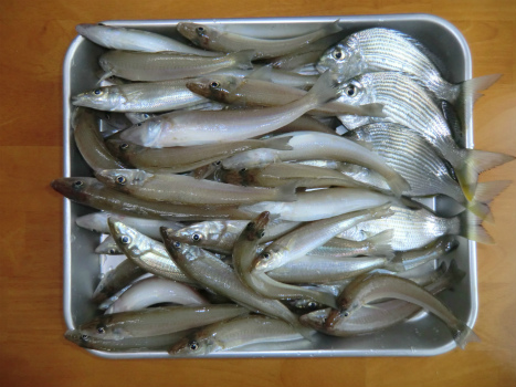 多点掛け(複数尾の魚がハリにかかることをいう)はあまりなかったが、満潮の潮止まりの14時半ごろまで釣り、キス60尾、キビレ4尾。