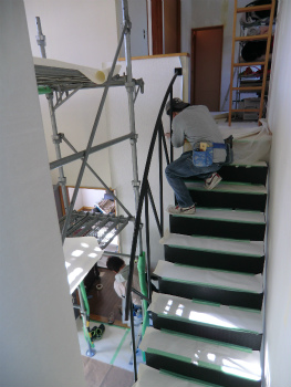 玄関は吹き抜けになっているので足場を組んで行われた。