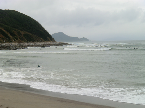 伊良湖岬のフェリー乗り場から浜をみると、多くのサーファーが楽しんでいる。